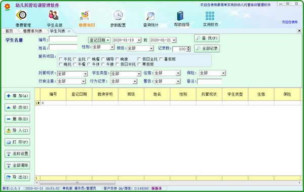 幼儿托管培训管理软件,是款针对培训学校财务人员专业使用的学生学费收缴打印管理系统。分为学生名册和缴费记录,支持批量增加,批量导入和打印功能,也支持一条条的增加和打印。支持单机版和网络版SQL SERVER联机使用。