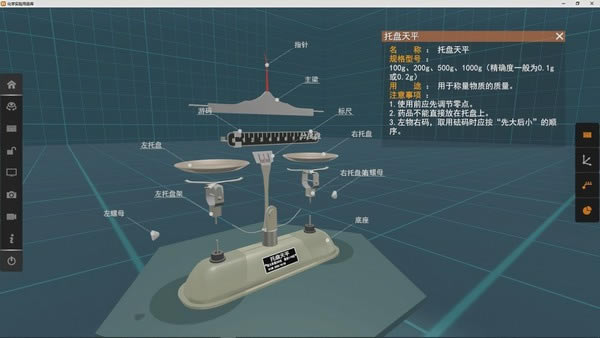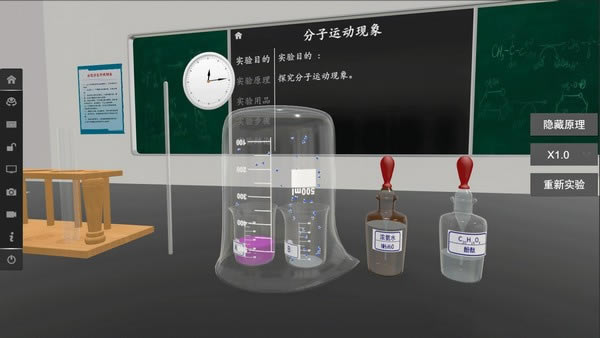 实验室取用规则:展示3D视角下规范化、细节化的基本实验操作,配合黑板详细、对应的操作说明,方便用户全方位、多角度的进行观察学习,将操作规范在头脑中具象化,加深对教材内容的理解。