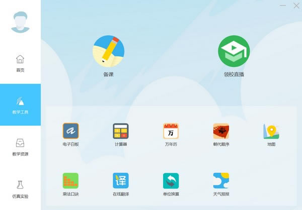 2、工具箱,推动课堂教学方式的变革,打造教育教学过程的高效集成基础环境,提供多种通用工具和学科工具,使知识信息呈现更方便快捷直观,使知识传递有趣、可交互、易操控。工具箱中内置了通用工具和学科工具,目前包含12个:计算器、写字板、画板、万年历、字典、朝代顺序表、地图、乘法口诀、元素周期、在线翻译、单位换算、天气预报
