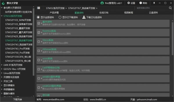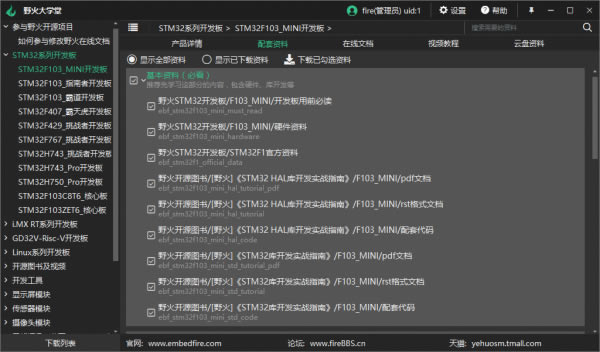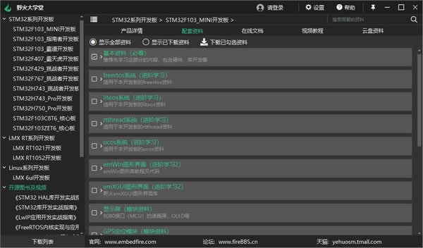 野火大学堂是野火论坛推出的电脑客户端,能够一键下载野火所有产品资料,主要用来方便用户下载野火所有产品的资料,是一款集资料下载,在线文档,在线视频和资料更新推送于一体的软件,免费登录,下载速度快过百度云,以后野火的资料发布和更新主要是通过野火大学堂来完成。