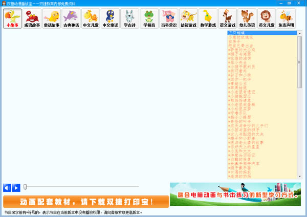双捷动漫播放宝是一款儿童学前教育相关的flash动画故事播放软件,拥有尽心挑选的动漫故事资源,包括小故事、成语故事、童话故事等,还用中文儿歌、学古诗、语文游戏、幼儿英语等动画,让您的孩子边玩边学习,扩展知识面。