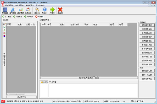 4、输出报表丰富:可分班级或分考室打印编排数据,同时还提供座位分布图打印、登分表、桌面贴条、准考试、考室门签、考生相片、分卷人数等各种报表打印及导出功能。