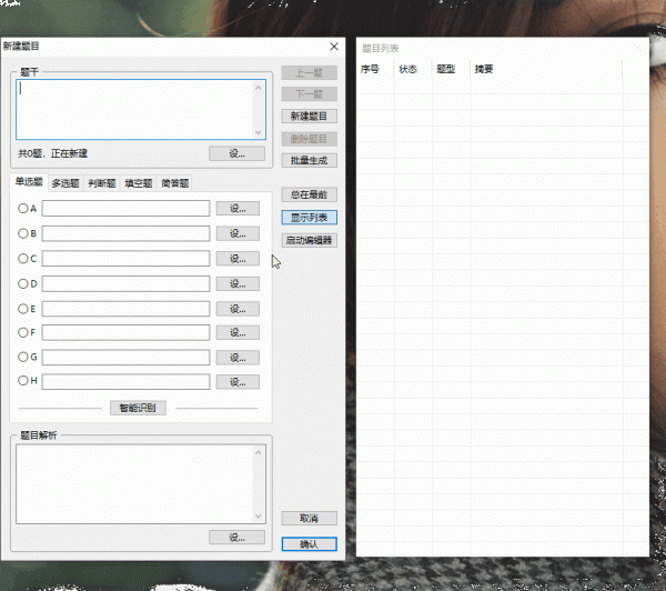 1.根据文本文档或word文档(需要预先自行安装Office套件,否则无法在本软件中直接打开)实现题库生成与编辑,现支持单选、多选、判断、填空、简答五类题目生成,另外支持题目组(即大题套小题)和基于以上五类题目的自定义题目类型(分类便于学习,例如“简答”和“论述”的区别)。