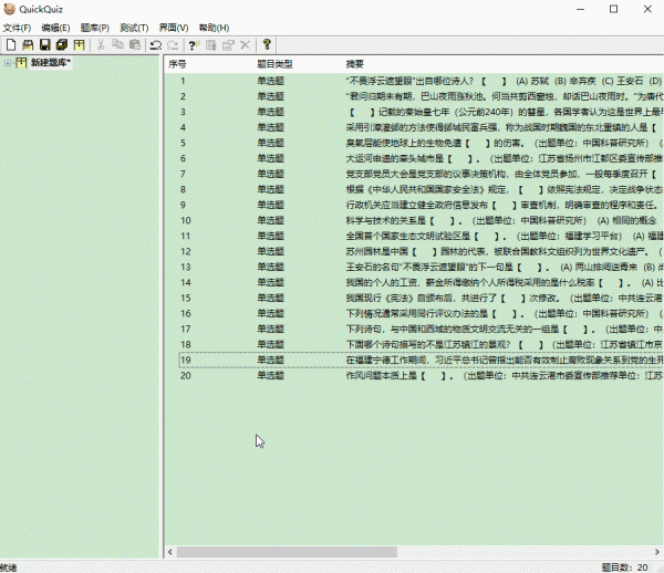 QuickQuiz(题库生成与学习备考软件)是一款备考备赛题库制作训练软件,能够根据文本文档或word文档实现题库生成与编辑,现支持单选、多选、判断、填空、简答五类题目生成,支持题目批量生成!