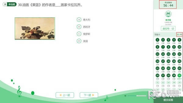 6、教师端正式开始考试后,学生端则正式进入答题界面,开始答题。在学生作答界面右方显示考试时间计时、学生信息、答题卡。答题卡记录每一道题答题状态,同时点击可任意切换题目。我们还提供了题目乱序功能,可以防止考生作弊。