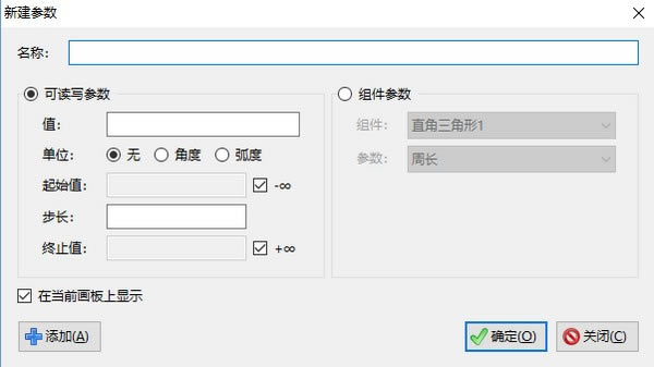 (3)参数。它是一个变量,含有名称、值、单位、起始值、步长、终止值这几个重要属性。参数分为只读参数和可读写参数,其中,只读参数是一个图形的属性生成的,例如线段的长度、圆的半径、双曲线的离心率等等,它只能在图形发生变化时被动地改变,用户不能主动地修改它的值;可读写参数是由用户手动添加的一个参数,可以主动修改。参数可以用在任何支持含参的表达式中并参与计算。例如,假设一个点的坐标中含有一个参数P,当P的值发生变化时,点也将会发生移动。