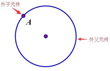 (10)外父元件。它和第11条外子元件相对应,表示点所吸附的元件,或生成构造元件的元件。例如,如果点P在创建时吸附在直线L上,则直线L是点P的外父元件;如果直线M和直线N相交生成了交点C,则直线M和直线N都是交点C的外父元件。