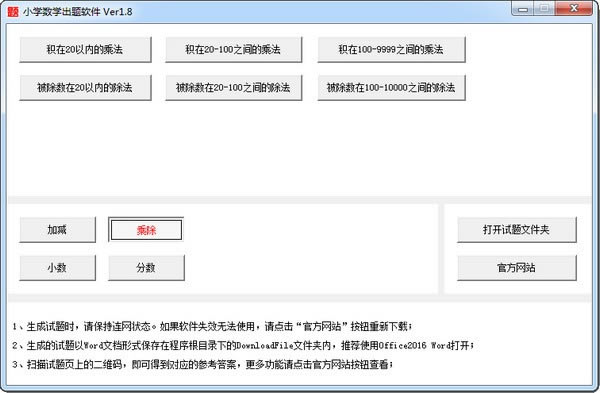 小学数学出题软件出题内容依据小学数学课程并按照难易程度做了分类设计,只要按照需求点击按钮即可生成对应的试题文件,打开以后可直接打印,扫描每份试题上的二维码即可查看对应的参考答案。
