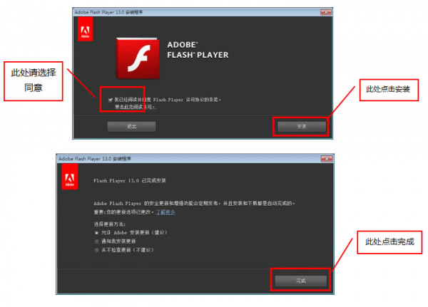 3) 在软件安装过程中会弹出提示页面要求安装FLASH组件。请在提示页面中先选择同意,然后点击安装,FLASH完装完毕后点击完成,继续下一步安装。