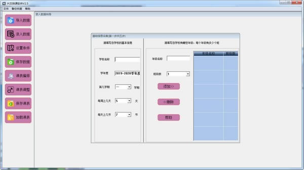 文件菜单:主要对课程表安排的基本数据进行增加、修改、导入、保存等操作。包括年级信息、课程信息课务安排、课时安排等
