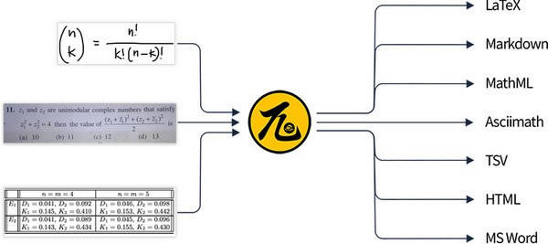 支持公式图像到 LaTeX,公式图像到 Microsoft Word,公式图像到 TSV(粘贴到 Excel 和 Google 工作表)等。