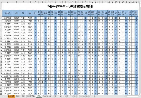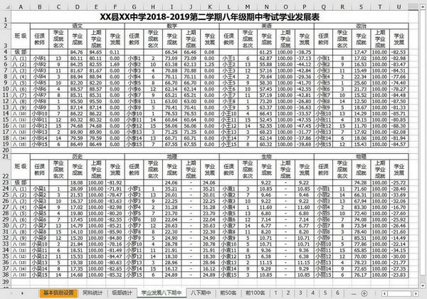 4、各班成绩表。表名为数字的为各班的成绩、年级排名、班级排名等,表中体现了班级的名次和在全校的名次、以及与上次对比后的进退情况,下方统计了本班的相关统计数据,统计齐全,信息一览无余,应有竟有!