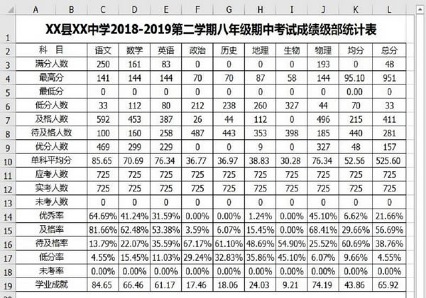 5、级部统计。此表包含全校各班各科的相关统计,如:*高分、最低分、及格人数、及格率、各分数段的统计、各班前50名、总体分数段的统计等!