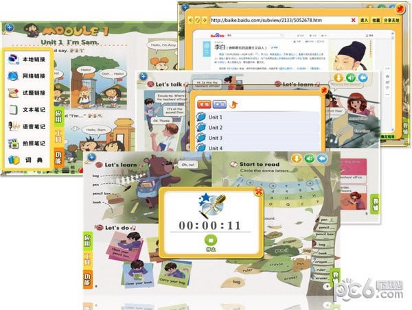 与课文同步的高清电子课本,发音纯正的点读功能,单词、汉字跳查,方便灵活画线标注、本地链接,网络链接,试题链接、文本笔记、语音笔记等功能,轻松实现多媒体预习、复习,让孩子养成良好的学习习惯,学会学习!