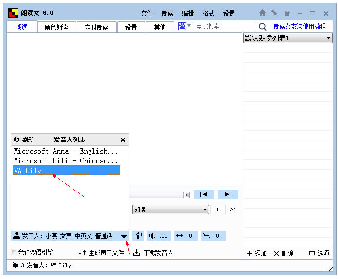 3、安装好语音库后,打开朗读女软件,选择该语音库就可以用它来朗读文本了。
