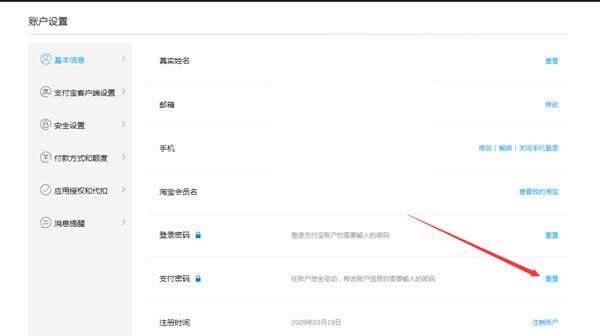 进入账号设置后,我们找到如图所示的支付密码一栏,看到后方有一个支付密码重置选项如图,点击。