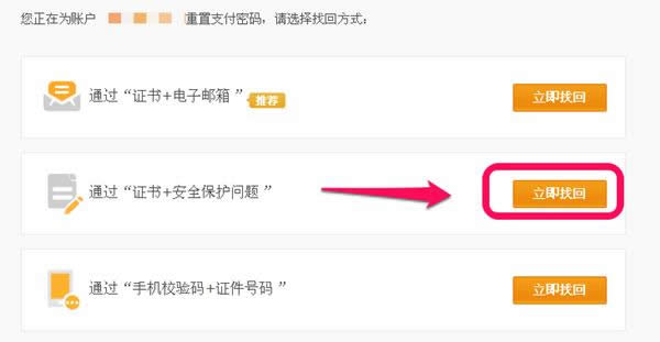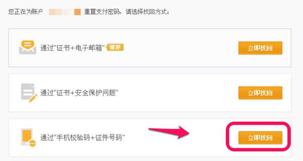 点击找回支付密码后,我们看到可以通过多种方法找回支付密码,我们一个一个来看看。首先,看第一个,通过“证书+电子邮箱”,点击后面的立即找回按钮,如图。