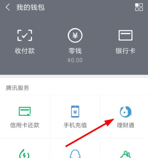 2、进入到微信钱包页面后,需要打开其中的“理财通”功能,单纯进行手机充值是无法开启自动充值服务的!