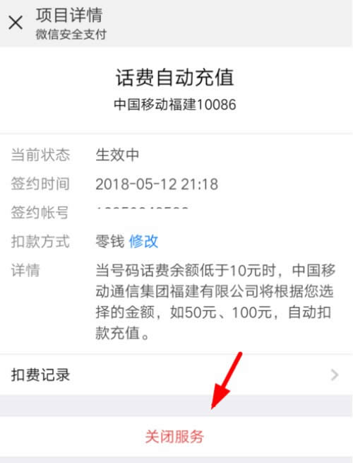 4、如此一来,打开自动充值话费的项目详情页面,便可以通过下方的“关闭服务”功能,直接取消自动充值话费的权限哦!