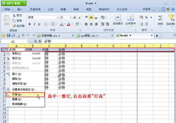 行高设置方法一:选中需要调节行高的整行,右击该行选择“行高”,在弹出的行高窗口进行行高设定然后点击确定。