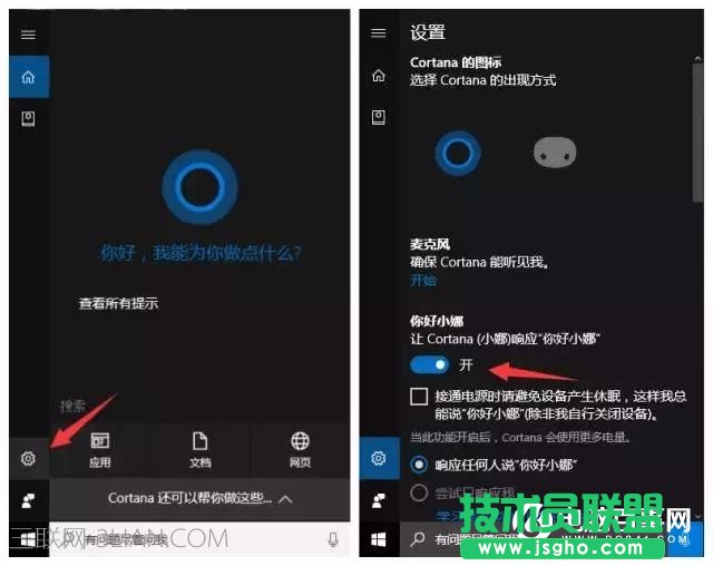 首先打开语音助手,[点击win10左下角搜索框]—[设置]—[打开“你好小娜”]。