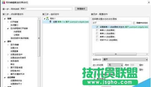 4、当从初始收缩状态点击成展开状态时,设置鼠标点击用例,面板状态选择到“展开”,并勾选推拉部件,方向选择下方。