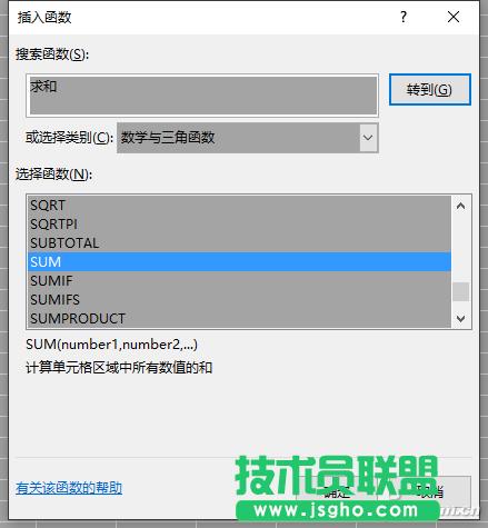 在打开的插入函数对话框中,先选择你想要使用的函数类别,比如求和函数SUM属于“数学与三角函数”类别中,在列表中找到该函数后,下面有对这一函数的简单说明。如果不知道想用的函数属于什么类别,可以直接在最上方的搜索框中输入关键字,比如“求和”,再点击“转到”,向导将会给出推荐。