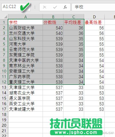 使用表格上方左上角的名称框,输入单元格区域坐标(如输入A1:C12),可快速选择指定的单元格或单元格区域。
