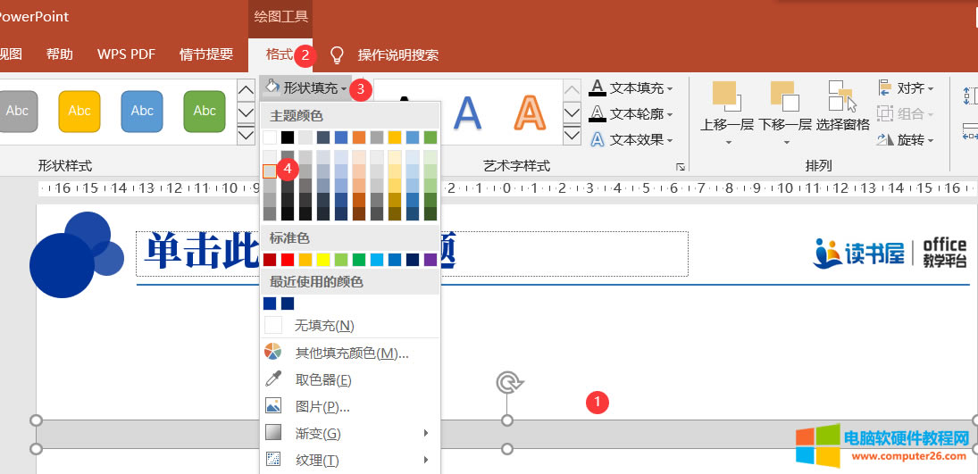 第一步:先绘制下方灰色矩形,鼠标单击“插入”—“形状”—“矩形”,默认刚绘制过的图形处于选择状态,然后在“格式”—“形状填充”改变为“灰色”,同时把开形状轮廓改为无。