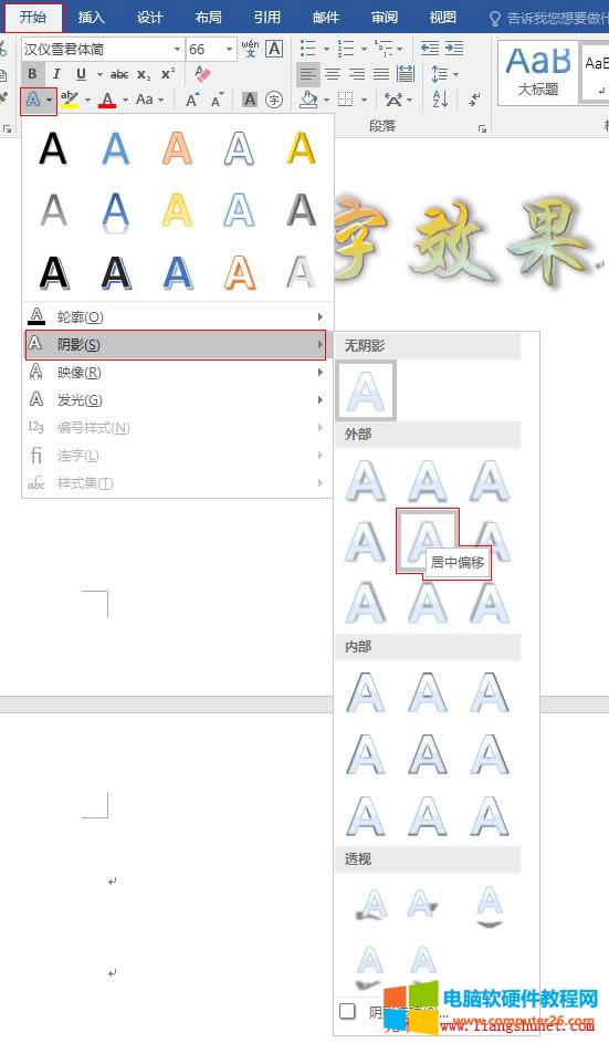 1、选中要设置阴影的艺术字,例如“艺术字效果”,单击“开始”选项卡下的艺术字图标,在弹出的菜单中选择“阴影”,再在展开的阴影样式中选择“外部”下的“居中偏移”,如图1所示: