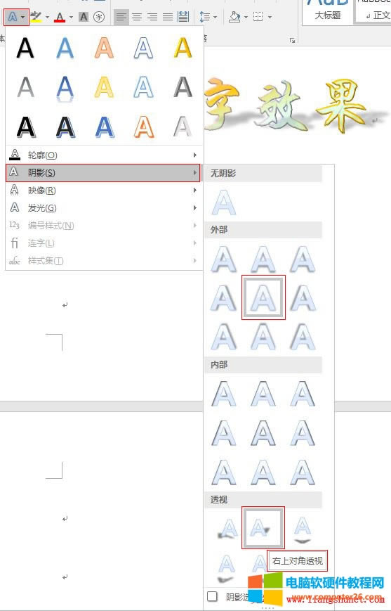 2、从预览效果来看,这种阴影样式还可以。阴影共有三种类型,即外部、内部和透视,如果不理解它们,最好每种选择一次预览效果;例如我们再选择一种透视效果,如图2所示: