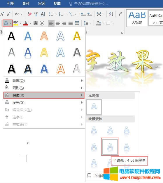 1、再次选中“艺术字效果”,单击艺术字图标,在弹出的菜单中选择“映像”,再在弹出的映像样式中选择“半映像,4 pt 偏移量”,如图3所示: