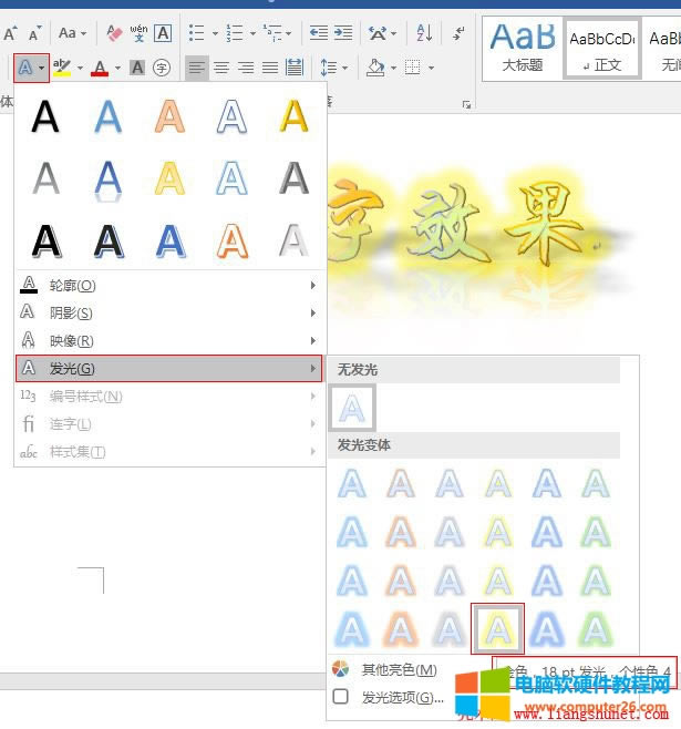 1、选中“艺术字效果”,单击艺术字图标,在弹出的菜单中选择“发光”,再在展开的“发光变体”样式中选择“金色,18 pt 发光,个性色 4”,如图4所示: