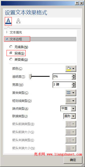 3、单击窗口底部的“文字效果”,打开“设置文本效果格式”窗口,默认选中“文本填充和轮廓”(即左起第一个A),单击“文本边框”展开,如图3所示: