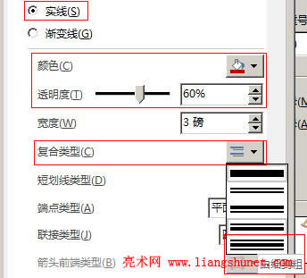 4、已经选用了“实线”,单击“颜色”右边的油漆桶选择“深红色”;把“透明度”设置为 60%;“宽度”保持之前设置的 3 磅;单击“复合类型”右边的下拉列表框,选择“由细到粗”,如图4所示: