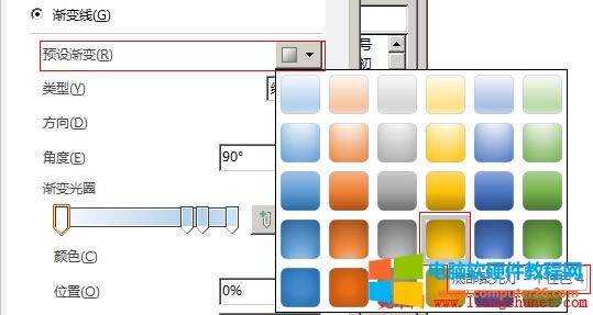 2、“渐变线”的这些参数都已经介绍过,单击“预设渐变”右边的下拉列表框,选择“底部聚光灯 - 个性色 4”,如图7所示: