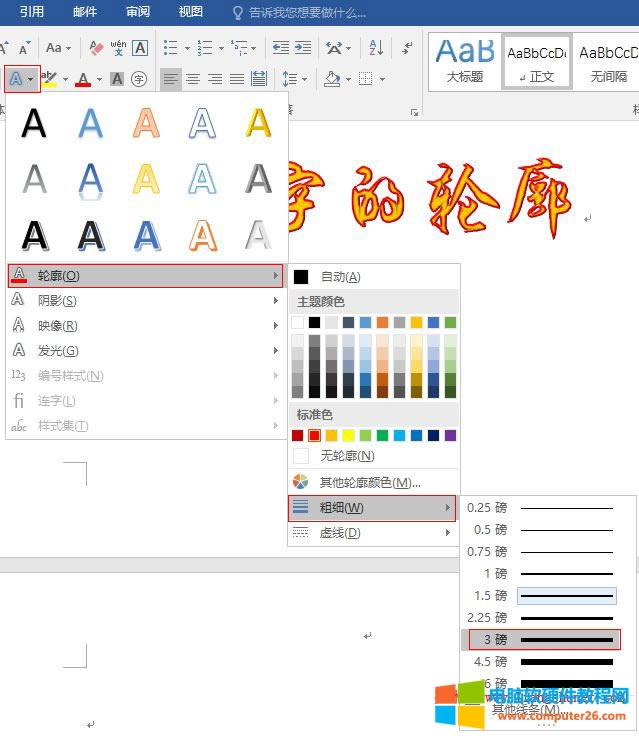 Word 2016 艺术字的轮廓加上 3 磅的边框