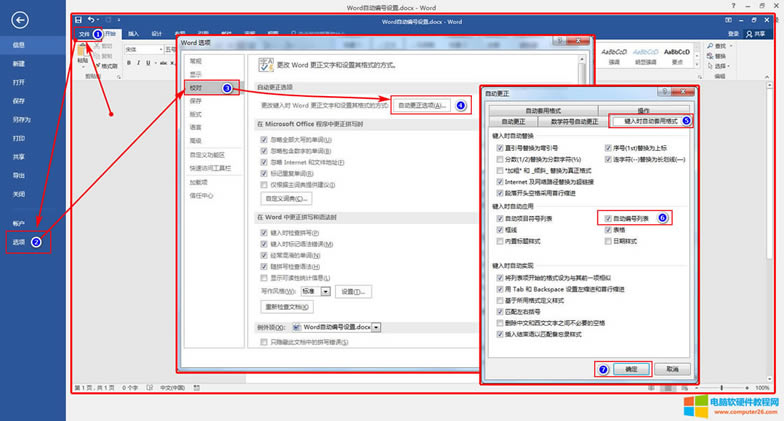 在“键入时自动应用”下, ⑥自动编号列表 复选框,勾选为打开,取消勾选为关闭