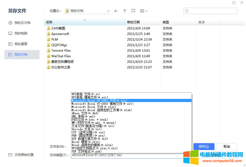 第三步:弹出『另存文件』对话框,将文件类型设置为xls即可,然后点击『保存(S)』。