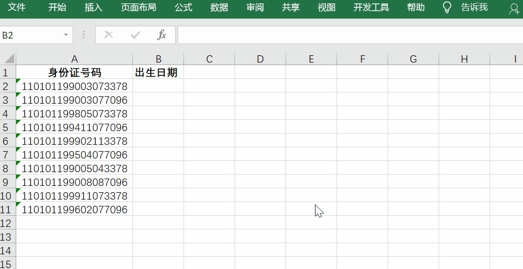 操作要求:根据A2~A11单元格中身份证号码,将对应的出生日期显示在B2~B11单元格中。