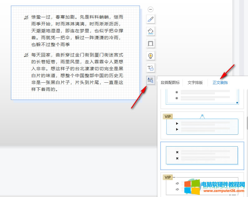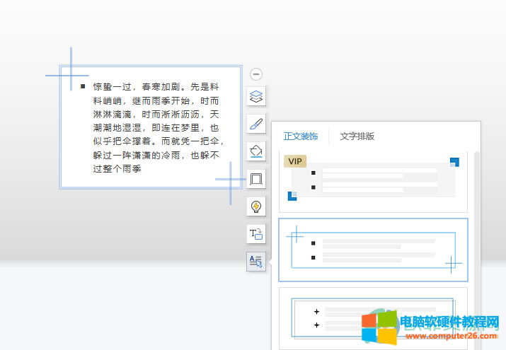 3、第三步,接下来我们尝试正文装饰,也就是回到文本框页面,点击文本框再点击一键速排,然后选择正文装饰,我们就能看到选择一个模板之后我们的文案内容变为了有边框、图标,字体也改变了的样式