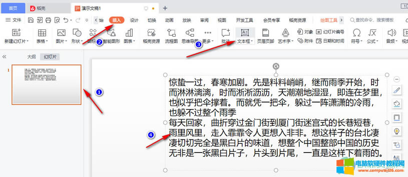 1、第一步,我们打开PPT,然后在PPT中插入一个文本框并在文本框内输入自己想要设置内容