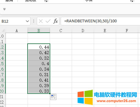 如图4所示,比如要生成0.3-0.5范围内的随机小数,可使用“randbetween(30,50)/100”的函数公式。