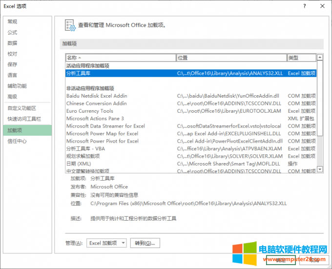 1. 需要在excel加载项中(文件-选项-加载项)选中“分析工具库”工具,并点击下方的“转到”。