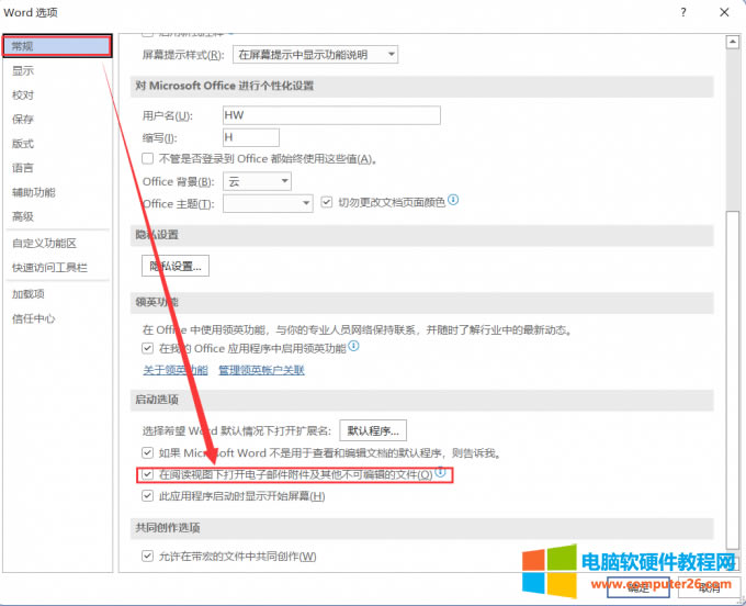 3、在word设置界面中选择“常规”,勾选“在阅读视图下打开电子附件及其他不可编辑的文件”选项