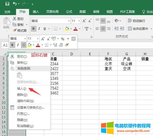 随后,将鼠标停留在单元格顶部,使用鼠标右键打开其快捷菜单栏,点击其中的“插入”命令,在原始数据的前方插入一列空白单元格,作为辅助列表。