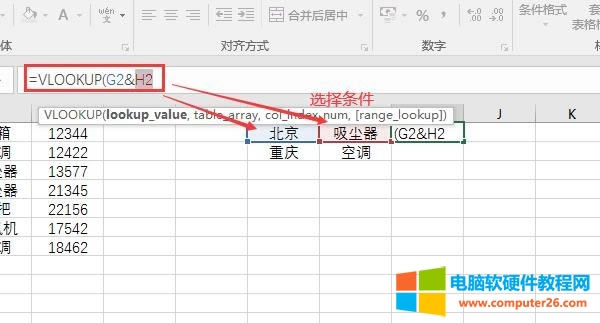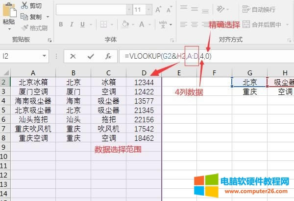 完成上述操作后,就可以切换到结果单元格,开始输入公式“=VLOOKUP(G2&H2,A:D,4,0)”。其中G2和H2就代表了筛选数据的两项条件。