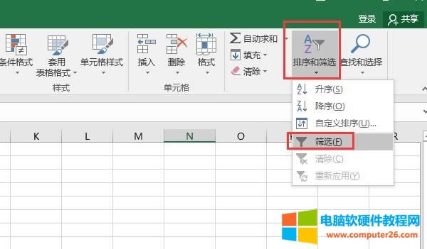 在开始选项卡的尾部找到“排列和筛选”工具,打开其下拉列表,点击其中的“筛选”命令。
