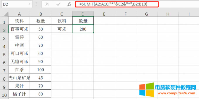 以统计可乐的销售额,使用函数=SUMIF(A2:A10,"*"&C2&"*",B2:B10)。
