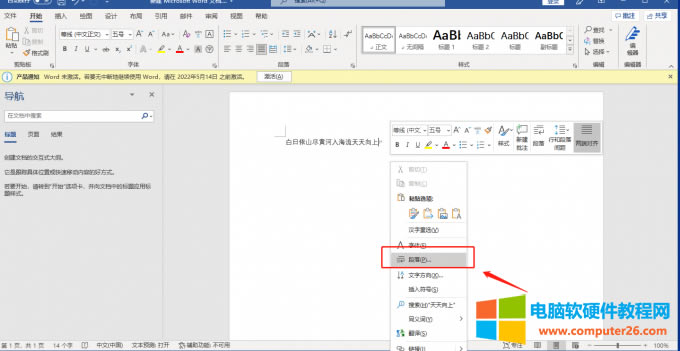 1、打开Word文档,鼠标右键点击需要设置制表位的那个段落,在出现的下拉菜单中点击[段落]功能。